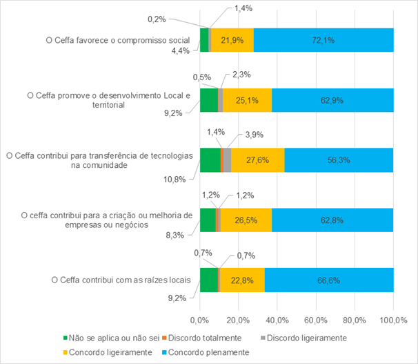 Como é possível observar os maiores índices de concordância estão em relação à participação social dos jovens e no fortalecimento das raízes locais, com 72,1% e 66,6%, respectivamente. Por outro lado, no que se refere à inovação tecnológica e/ou transferência de novas tecnologias do CEFFA para o território, identificamos o menor índice de concordância, 56,3%.