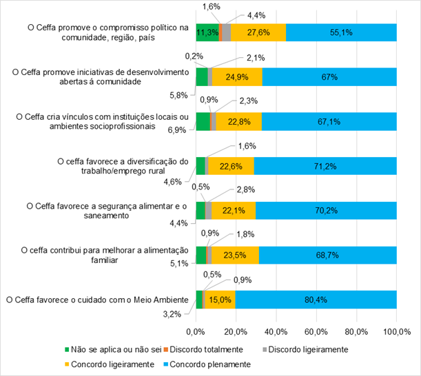 Portanto, na perspectiva das famílias, o CEFFA promove ações importantes que corroboram para o Desenvolvimento Territorial Local, com fazeres formativos que fortalecem em especial o compromisso social, o cuidado com o meio ambiente, a segurança alimentar e a diversificação do trabalho. As percepções com menor índice de concordância merecem atenção e, a partir dos objetivos dessa pesquisa, passarem a compor as pautas de discussão sobre o aperfeiçoamento do trabalho, com especial dedicação às fragilidades apontadas.