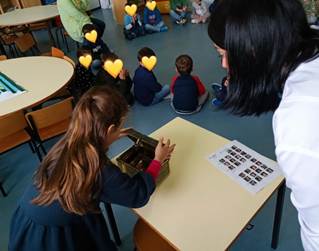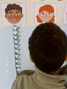 O “Emocionómetro” tinha como principal objetivo a identificação da própria emoção que cada criança estava a sentir, devendo colocar uma mola com a sua fotografia na fita correspondente.