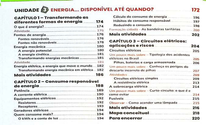 Embora o título “Energia… disponível até quando?” indique uma visão mais global sobre o uso de energia, a unidade se restringe à abordagem de conceitos da Física, como circuitos elétricos e transformação de energia. Por mais que haja potencial para articular discussões sobre a evolução histórica do aproveitamento da energia e as implicações sociais e ambientais do seu uso, estas são ofuscadas pela ênfase excessiva em conteúdos conceituais de forma isolada.
