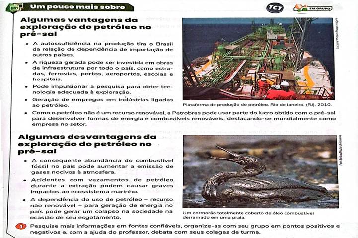 No caso da L1U1C2, são iniciadas discussões sobre a contaminação dos oceanos por substâncias como o petróleo (Figura 4. No entanto, essa temática não é central para a estruturação do capítulo e tampouco é devidamente articulada a conhecimentos científicos que contribuiriam para a discussão, como, por exemplo, a mobilização de conhecimentos da Química relacionados a misturas e métodos de separação. A instrumentalização desses conhecimentos oportunizaria a construção de um processo de ensino e aprendizagem dialógico em que, ao apropriar-se criticamente dos saberes científicos, os(as) educandos(as) seriam capazes de analisar a situação e posicionar-se diante dela de forma consciente e reflexiva.
