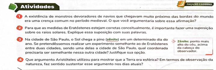 A exemplo disso, temos a US L1U1C1, destinada ao estudo do formato da Terra e dos fenômenos cíclicos decorrentes dos movimentos do planeta. O capítulo inicia-se de forma contextualizada, abordando fatos históricos que explicitam os caminhos científicos para a compreensão do formato da Terra, desde as mitologias antigas em volta de superstições com monstros nos oceanos, até os cálculos matemáticos que davam indícios para a esfericidade do planeta. Entretanto, as atividades voltadas para essa seção do capítulo (Figura 5), assim como as subsequentes, focam-se apenas nos aspectos teóricos, o que reduz o potencial das discussões críticas desenvolvidas no início do capítulo. A seguir, um excerto das atividades que se encontram entre os tópicos do texto: