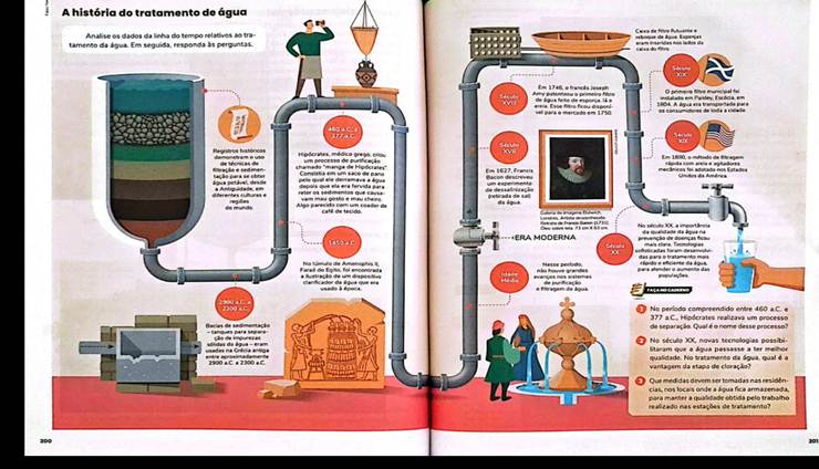Em relação ao primeiro movimento (i), temos, como exemplo, a US L1U3C3 que foca no estudo de misturas e métodos de separação. Embora enfatize conceitos isolados de Química, o capítulo apresenta, em alguns momentos, contextualizações interdisciplinares. Um exemplo disso é a seção Em Foco (Figura 7) que aborda aspectos históricos da evolução das tecnologias voltadas ao tratamento de água. Entretanto, destaca-se que essa contextualização busca apenas ilustrar uma aplicação para o conteúdo conceitual de Química. Portanto, a interdisciplinaridade é evocada apenas para reforçar a importância da conceituação científica e não para provocar uma reflexão conjunta que permita ao(a) educando(a) perceber as implicações sociais e ambientais do tratamento da água ao longo do tempo.