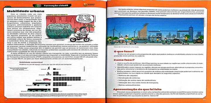 Em relação ao segundo movimento (ii), podemos citar o capítulo L2U4C3, que vai de encontro à ideia de contextualização defendida pela BNCC. Esse capítulo discute a criação das máquinas térmicas no contexto do desenvolvimento das Revoluções Industriais. Além de apresentar contextualizações históricas, ainda discute problemas ambientais consequentes da poluição atmosférica. Por fim, apresenta uma atividade (Figura 8) que promove a reflexão por parte dos(as) educandos(as) acerca de problemas do seu bairro/cidade que impossibilitam a utilização de meios de transporte menos poluentes, a fim de buscar alternativas sustentáveis para a mobilidade urbana.