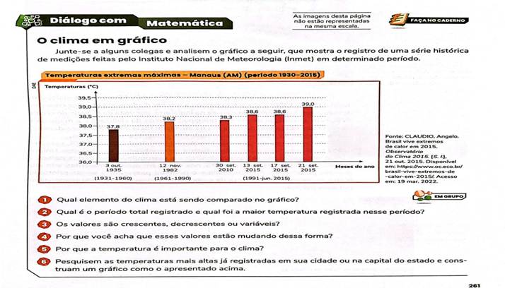 Vale ressaltar que a interdisciplinaridade com a Matemática, apresentada no início do capítulo (Figura 10), é articulada através da interpretação gráfica de dados sobre as maiores temperaturas registradas no estado de Manaus, no período de 1930 a 2015. A partir da reflexão dos(as) educandos(as), é possível promover diálogo sobre outras questões atreladas às mudanças climáticas, como o avanço desenfreado de desmatamento florestal, o impacto de desastres ambientais e a diminuição das condições necessárias para o desenvolvimento da biodiversidade. Dessa forma, a atividade não se limita à simples reprodução de conteúdos, mas busca promover a construção coletiva do conhecimento ao estimular educandos(as) a desenvolver habilidades críticas para relacionar conceitos científicos com o problema discutido.