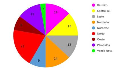 Referente aos questionários eletrônicos, buscou-se alcançar os 1.471 profissionais por meio do contato[6] com os coordenadores do PEI de todas as escolas. Obteve-se 108 respostas, perfazendo 7,4%. Apesar do pequeno percentual de participantes, o Gráfico 1 demonstra que a amostra contempla a atuação em escolas localizadas em todas as regionais administrativas da cidade.