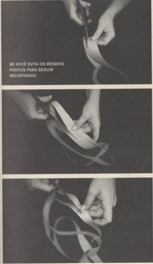 Proposição 1: Caminhando - Após apresentações iniciais e uma conversa sobre questões como o motivo da escolha de participar da oficina e a concepção de arte de cada uma, apresentamos o conceito científico: O que é a Fita de Moebius?. A metáfora da fita em “Caminhando” se dá pela subversão da forma de representar o espaço, solicitamos o corte da faixa de Moebius: