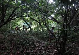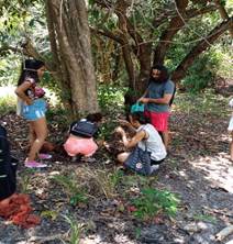 Na trilha, o grupo, em fila, adentrou a mata fechada, quando se deparou com uma oiticica utilizada como suporte para expor as materialidades coletadas por Francisco, durante suas andanças: fotos, um crânio de mamífero não identificado, pena de ave, duas mudas de orquídea, sacos para mudas, uma pá e logo ao lado mais orquídeas. Letícia Moreira e Márjory Garcia pegam as pás e os sacos e transplantam as orquídeas, levando com elas um pedaço do material genético que habitava o Tunga, que estava fadado ao concreto.