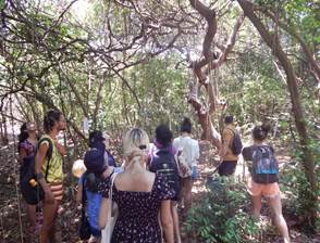 Sentamos no chão sob a copa de um cajueiro, todos compartilhavam o alimento e conversavam sobre temas diversos que foram disparados até então. Um ou outro artista movimentava-se e explorava os espaços, quando, de repente, um homem de moto identificou-se como segurança do local e policial, perguntou o que fazíamos ali e foi explicado que se tratava de um grupo de estudos da UFC, que havia sido enviado um e-mail para a empresa explicando a ação. Ele falou que aquela área estava perigosa, que passou a ser ponto de droga e que os policiais tiveram muito trabalho para “tirar os vagabundos de lá”. Por último, aconselhou que todos fossem embora, por uma questão de segurança. O conselho, quase em tom de ameaça, frustrou uma parte do trajeto que pretendia margear o riacho, afluente do Cocó, até a extremidade do terreno. A única mediação possível foi dizer que todos sairiam, mas que iriam pela trilha, só para ver algumas árvores.