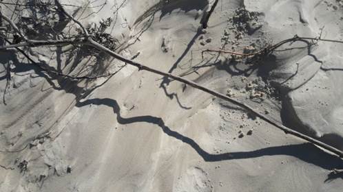 Mais abaixo (imagem 4), o oposto se dá; galhos curvilíneos projetam linhas quase retas criando um desenho dinâmico entre curvas e retas sobressaindo ao solo visivelmente menos alterado pelos movimentos das marés. Fragmentos de instantes, ou um entretempo dos acontecimentos que vibram em profundidade numa efervescência de virtualidades, as quais afetam a forma de sua aparição na superfície da areia.