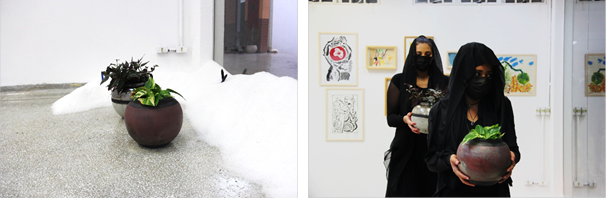 Imagens 1 e 2 - registro das ações Carpiderias/Me dê terra na abertura da exposição Apotheke Londrina.