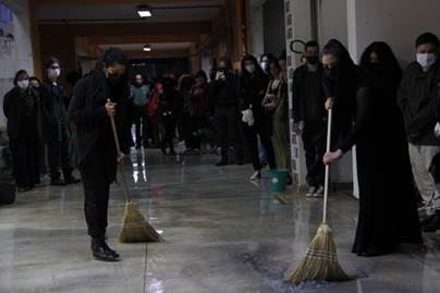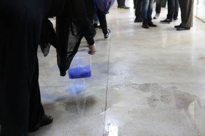 As performances Carpideiras / Me dê terra, realizadas na abertura da exposição Apotheke Londrina, incorporaram o sentido de ‘procissão’ de Beuys, no qual as artistas caminharam e deslocaram-se suscitando o movimento do público que acompanhava a ação de lavar as escadas e pisos do departamento de arte, “mulheres que tentavam limpar, lavar, expurgar o que persiste em ficar para atrapalhar a alma humana ….”[4] e desenvolver uma ação artística em defesa da natureza e rumo à cura de um mundo em destruição, em proporções jamais alcançadas.