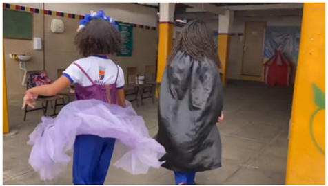 Procurando uma entrada na análise do curta-metragem realizado pelas crianças, percebemos que a paisagem do espaço público externo à escola aparece apenas em um breve e curto momento do filme (Imagem 1), e em um vislumbre passageiro ela rapidamente sai do plano para dar lugar ao movimento rápido das crianças que interagem no pátio da escola.