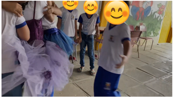 Realizamos encontros semanais ao longo de três meses (agosto a novembro de 2022) com seis crianças, todas do gênero feminino e com 8 anos de idade. Utilizamos aqui nomes fictícios por elas escolhidos, a saber: Annabelle, Arlequina, Bruxinha, Cineasta, Diabinha e Fada. Todos os encontros ocorreram nas dependências de sua escola.
