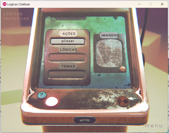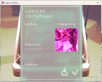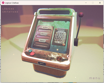 Entre as categorias Ações, Lógicas, Temas e Imagens, o jogador deve escolher duas distintas, podendo optar pelo modo randômico e deixar o programa sortear também as categorias. O Som funciona como um estímulo extra, que pode ou não ser acionado. Estabelecidas essas definições, o sistema seleciona, de forma aleatória, entre os dados armazenados de cada categoria e apresenta, na tela, os dois vetores que orientarão o processo criativo.