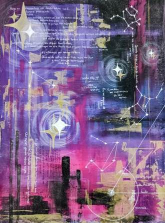 A pintura favorita, produzida nesta pesquisa, a qual se considera ‘amarrar’ da melhor forma os conceitos e ideias abordados neste texto, é a Figura 02, onde palavras escondidas geram contornos de interrogação e estranhamentos da escrita. Nessa pintura, movimentos ondulantes se ‘chocam’ com retas, tudo sempre buscando o mesmo ideal: tentar visibilizar os emaranhamentos emocionais que conectam e desconectam os seres. Nela, o uso das cores dialoga com o olhar e as emoções depositados sobre a tela; os signos utilizados referenciam momentos e indivíduos específicos que se (des)conectaram, ao longo de toda a biografia pessoal. Enquanto isso, as estrelas retratadas inspiram a sonhar.