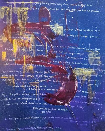 Aqui já se nota a passagem para uma pintura mais abstrata e fluida. O uso de cores foi pensado para mesclar-se com o teor das escritas e o texto começou a soltar-se das rédeas da formatação linear.