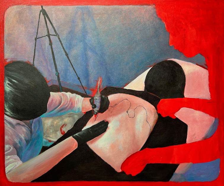 A videoarte RASTRO [3]surge do desejo de integrar as linguagens da tatuagem e da pintura como forma de expandir o campo de experimentação poética a partir da decisão de permanecer no curso de Artes Visuais. De um lado, a tatuagem — prática inicialmente externa ao contexto acadêmico — ofereceu um espaço de segurança durante um período de incerteza, simbolizando a possibilidade de continuidade artística mesmo fora dos circuitos institucionais. De outro, a pintura, linguagem inaugural da minha trajetória, representa o elo afetivo com o percurso de graduação.