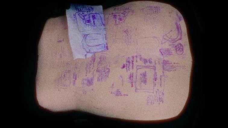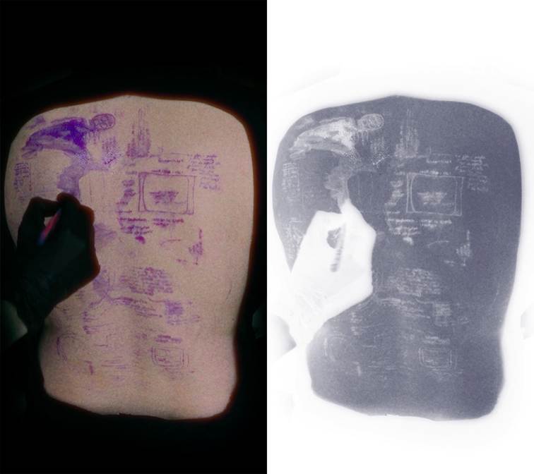 Por fim, analiso um dos recursos técnicos empregados nesta produção que é o uso de frames em negativo, cuja simplicidade contrasta com a densidade simbólica que carrega. Mais do que um efeito visual, o negativo opera como metáfora do próprio processo criativo, funcionando como um espelho invertido que revela, de forma latente, aquilo que está em vias de se tornar visível. Nesse sentido, as marcas e ilustrações gravadas na pele — que pertencem ao campo do efêmero e do íntimo — ganham corpo ao serem projetadas como imagem negativa, sinalizando a transição da pesquisa do plano teórico para uma visualidade plástica. Ao inverter os valores da imagem, esse recurso torna perceptível aquilo que está oculto, sublinhando o potencial transformador do gesto artístico.